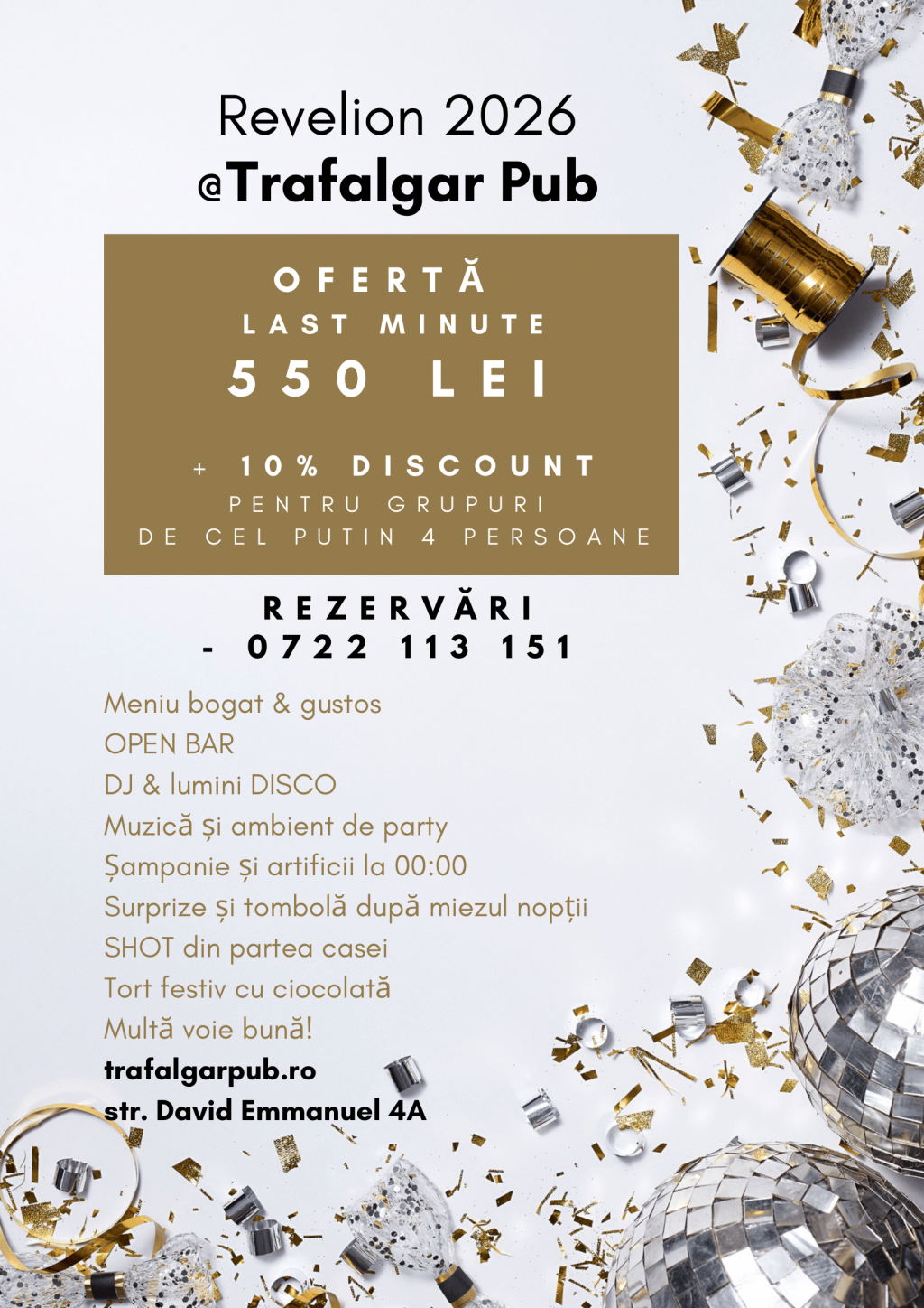 Happy Hour la Trafalgar Pub – Gustă bucuria verii! 🕒 Luni–Vineri, 15:00–18:00 Bucură-te de 15% reducere la toate mâncărurile și băuturile noastre preferate!🥗🍻 Savurează gustul verii într-o atmosferă britanică autentică. ❗ Excepții: Meniul zilei, Berea Casei, Guinness, Kilkenny. Consulta regulamentul complet aici.