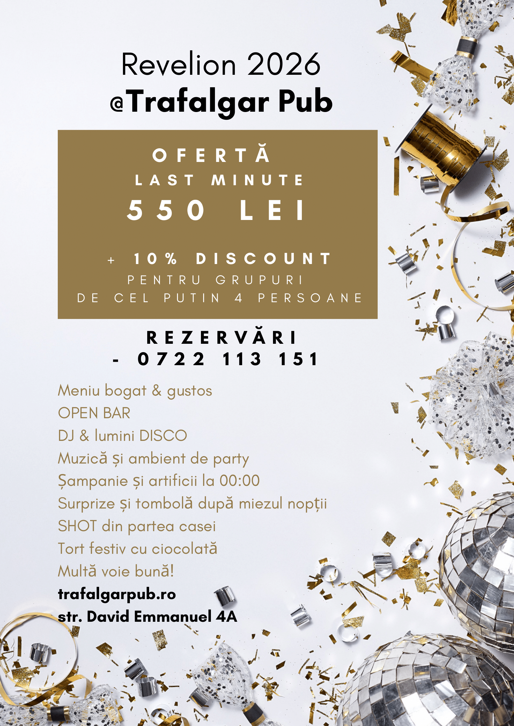 OFERTA WEEKEND 08.04.2023 – 09.04.2023 • ORICE PIZZA + CARLSBERGDOZA (500ML) SAU GUINNESS (330ML) = 55 RON •ORICE BURGER + CARLSBERG DOZA (500ML) SAU GUINNESS (330ML) = 55 RON